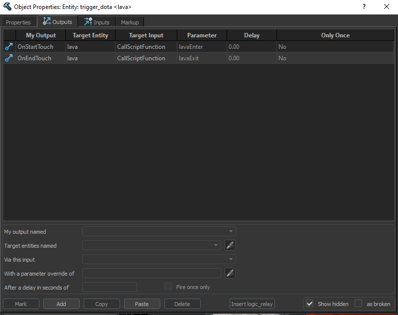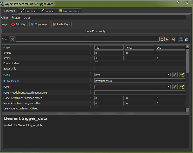 Then convert the mesh to Entity by pressing Ctrl+T or find the Outliner => Right Click => Selected Meshes => Tie to Entity. Afterwards, name it plus assign this Entity script to lavatrigger.lua <-- you can name it whatever you want.